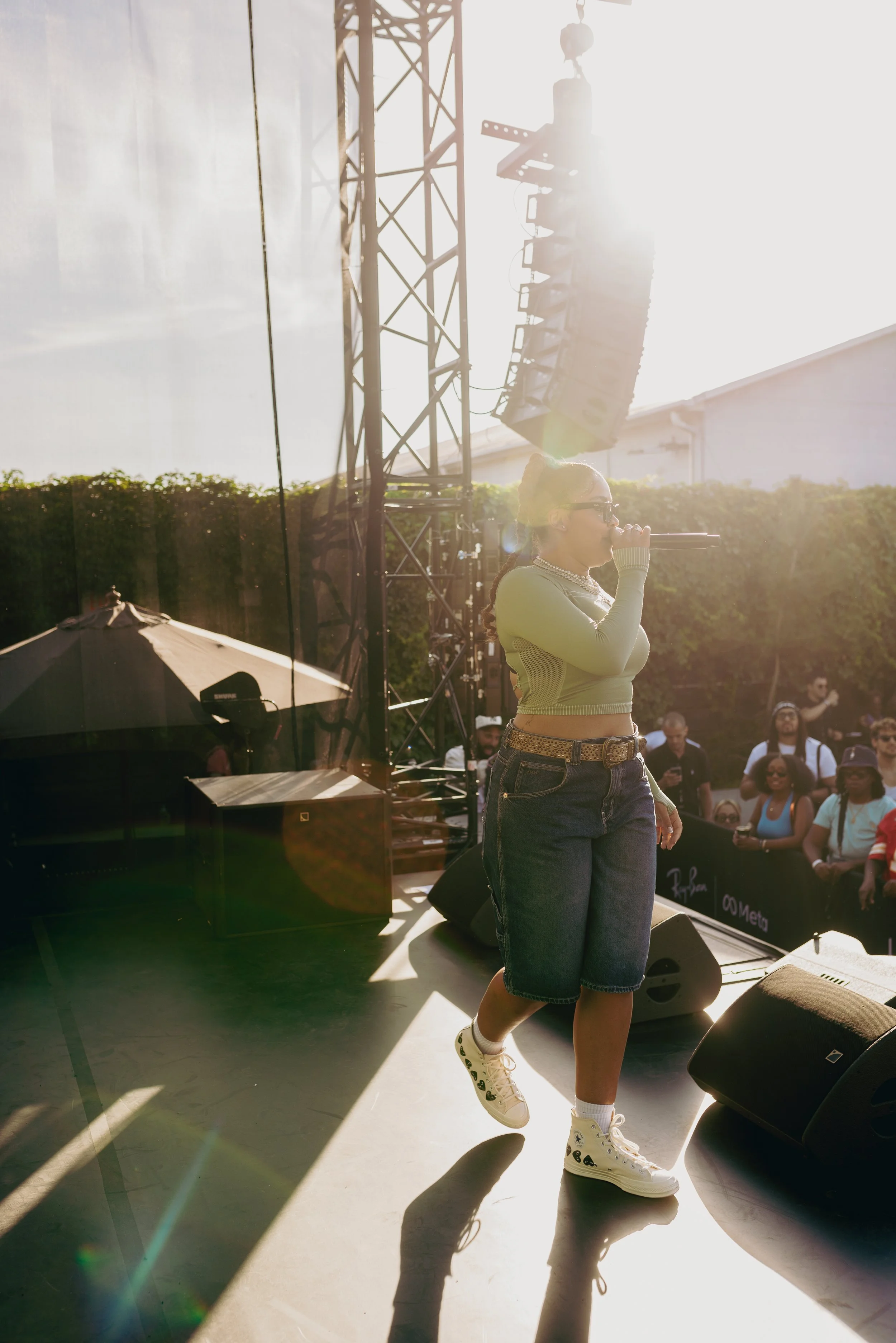 A woman with glasses, in a green long-sleeve shirt and denim shorts, stands on stage holding a microphone, with a crowd of people watching her perform outdoors during the day.